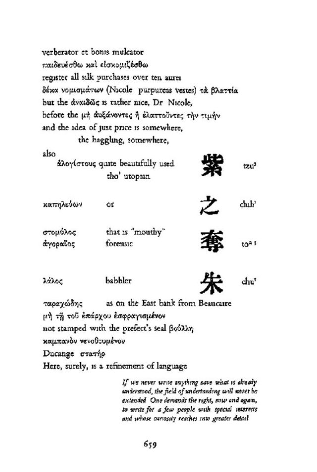 „Pesma“ je pisana uz pomoć nekoliko različitih jezika i sistema pisanja (engleski, italijanski, starogrčki, kineski, egipatski hijeroglifi) i neodredivom kombinacijom proznog, poetskog i prozaidnog („pesma u prozi“) izraza, uz esejističke crtice i, naposletku, citatne fragmente. Igranka tu nije gotova, jer THE CANTOS sadrži i nekonvencionalnu upotrebu interpunkcijskih znakova, vertikalnu i figuralnu tipografiju, ispisivanje po marginama i korišćenje matematičkih i uopšte neknjiževnih simbola poput brojeva, algebarskih oznaka i tabela. A nismo se ni dotakli eruditnog, ali haotično aluzivnog sadržaja, koji je od strane E. Paunda izložen kao u košmarnom transu.