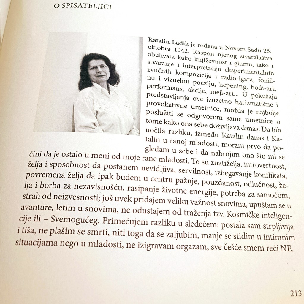 Izdanje je ipak i dalje sjajno jer u pitanju Katalin Ladik. Uglavnom je poznajem kao provokativnu i eksperimentalnu performativnu umetnicu; kada bih bio lagodan u ocenama, rekao bih da je svojevremeno Katalin Ladik radila ono o čemu Marina Abramović sanja. U strahovito talentovanoj generaciji vojvođanske/SFRJ neoavangarde, Katalin Ladik je sa pravom bila jedna od vatronoša i all-starova; dok su se drugi možda tu i tamo folirali i izmotavali, KL je uvek išla ogoljeno, furiozno, nogom u vrata, glavom u zid i sa 110%. Poezija mi pak odaje drugačiju Katalin: ranjivu, usamljenu, introvertnu i osećajnu.