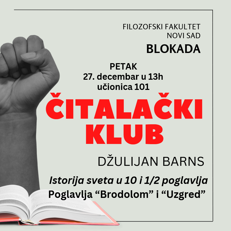 Dok se ne ispune zahtevi studenata, biće blokadnog čitalačkog kluba — uključujući i još nenajavljeno praznično izdanje u okviru Novogodišnjeg programa. Očekujte dakle književna druženja barem jednom nedeljno — a možda i više! — sve do oslobođenja. Najave slede uskoro. Vidimo se!