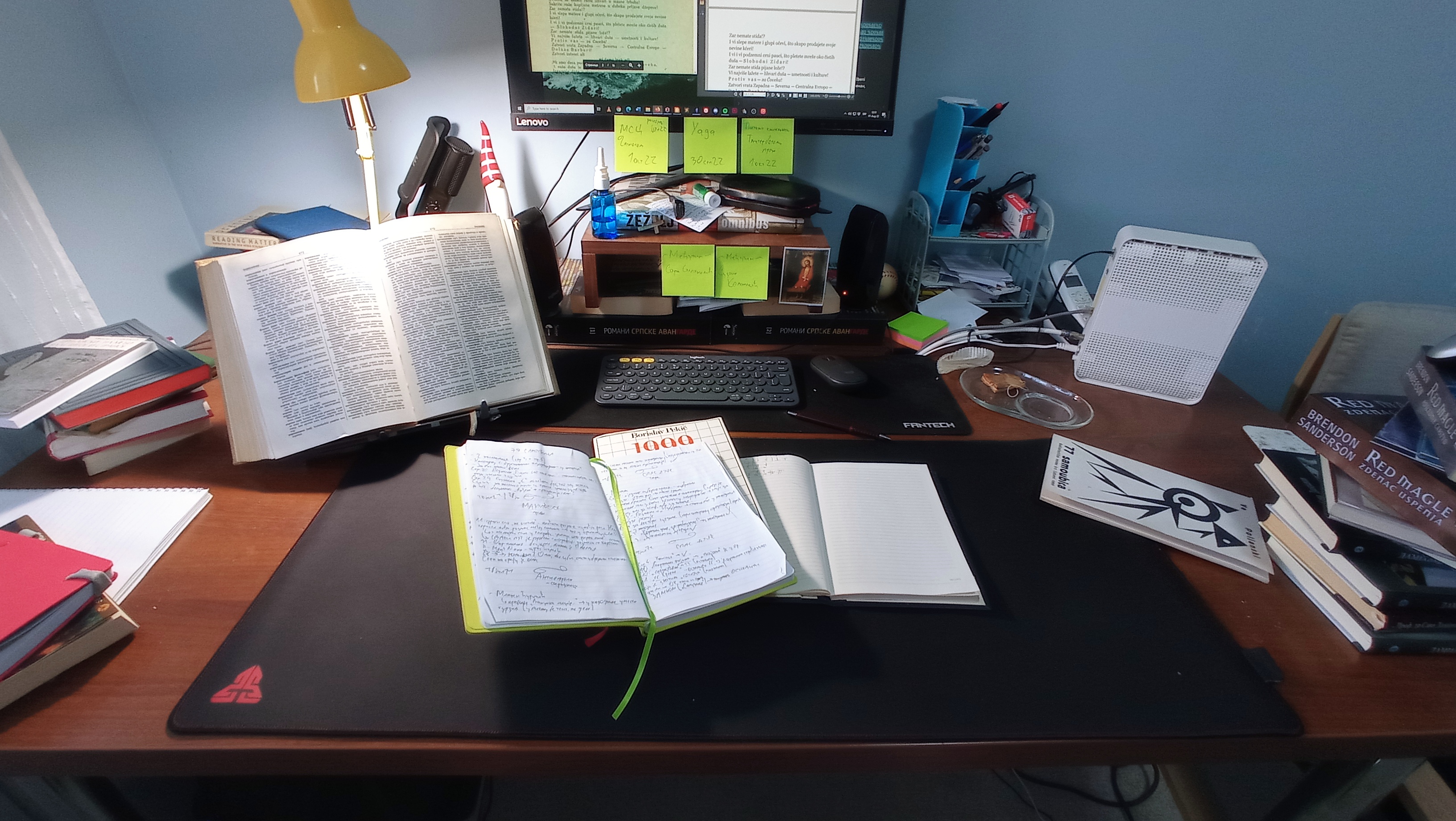 — На налепницама: два сјајна рада за МЕЂУТИМ, ДНК чекају уређивање и качење — када се људи врате кућама и поново упале екране. Горњи ред су три рада која ће бити завршена до јесени: о америчким путописима Војислав Деспотова, између осталог једне од првих (?) квир ствари у нашој књижевности; о пародијској фолклорној видео-игре YAGA, где ћу имати изговор да наглас размишљам о пародији у видео-играма, које, што је занимљиво, нема онолико колико сам мислио да има.