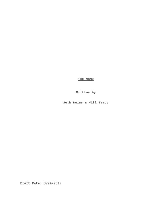 Наишло ми је да суспендујем тренутне читалачке пројекте & напуним читач неким сценаријима са прошлогодишњих Блеклиста (The Black List). Што рече Томаж Шаламун у „Рођенданима“: „можда зато што је таква киша“. Први је на списку хорор/трилер/црна комедија МЕНИ (THE MENU), по којем је већ снимљен филм — од пре неколико дана и у нашим биоскопима — са Ањом Тејлор-Џој и Рејфом Фајнсом у главним улогама.