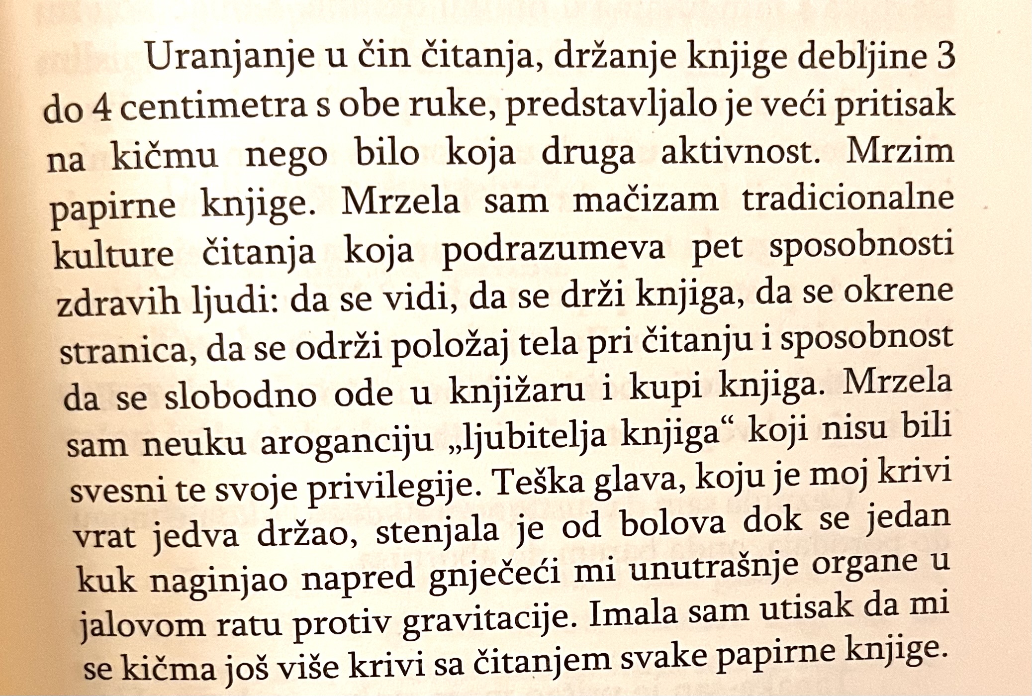 Kao čitalac naginjem prozi, što će reći da količinski više čitam romane, priče i nefikciju, nego poeziju — pa mi je za čitanje pesničkih knjiga potrebno vremena da rekonfigurišem mozak za čitanje ciklusa, a ne poglavlja, i ne uđem u flow. Sa En Karson, koja pisanju pesničkih zbirki prilazi kao romanopisac, odmah mi je sve kliknulo. Njene knjige, iako raznolike, rasute i fragmentarne — svaki stvaralac isprva skicira svoja dela tako što u beležnicu zapisuje različite misli, citate, rečenice, fragmente, dnevničke zapise, opaske, tvitove, recepte, horoskope i ostale marginalije, a Karsonka kao da te svaštare objavljuje u integralnom obliku — elem, iako oblikom raznorodne, njene zbirke poezije objedinjene su snažnom zajedničkom pričom, temom ili konceptom, zbog čega izgledaju kao hipermoderni epsko-lirski projekti ili savremene poeme. Ti su središnji zapleti toliko sočni da mogu biti premise filmova: tu je priča o pesnikinjinom prvom, propalom braku (LEPOTA MUŽA, 2015, KCNS, prev. Bojana Vujin / THE BEAUTY OF THE HUSBAND, 2001), zatim retelling o antičkom čudovištu Gerionu (AUTOBIOGRAFIJA CRVENOG, 2021, KCNS, prev. Arijana Luburić Cvijanović & Igor Cvijanović / AUTOBIOGRAPHY OF RED, 1988), pa nastavak retellinga o čudovištu (CRVENI DOC>, 2023, KCNS, prev. Arijana Božović / RED DOC>, 2013) — ko još piše nastavak poput ALIENSA, TERMINATORA 2 ili KUMA 2, ali u poeziji? Za nekog drugog autora bi kao nemaštoviti blurb zvučalo da su istovremeno klasični poput mermerne biste i avangardni kao prdež u galeriji, ali En Karson je En Karson. Pre godinu dana, Snežana i ja smo „Naglas“ pokrenuli sa sledećim planom: neki događaji će biti posvećeni En Karson, a ostale ćemo smisliti usput. Toliko nas je opsedala, i srećom nastavlja da nas opseda. (Na slici: odlomak iz intervjua sa En Karson u The Paris Review, The Art of Poetry no. 88)