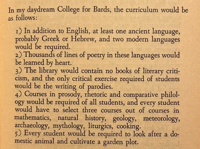— Picrel je Odnov idealni program kreativnog pisanja poezije. Slika je sa Tvitera, a odlomak je iz Odnovog eseja „The Poet and the City“, gde se mogu pročitati još neke pametne stvari. Da se u poeziju razumem kao što se ne razumem, zaveo bih na svom programu pisanja isti teror. Polaznicima bih mozak ispirao klasičnom retorikom; terao bih ih da, praveći lične pesmarice omiljenih pesama drugih stvaralaca, troše sveske i sveske; repozitorije bih zatrpao enciklopedijama, pregledima i udžbenicima o svakoj temi osim knjievnosti i književne kritike, od bitkoina do meteorologije. Tačka (5) toliko je lepa & pametna zamisao da mi se duša cepa što polaznicima Izviiskre ne možemo da damo po mače ili makar orhidejicu na početku svake radionice. Možda nešto smislimo za jesenju sesiju 2024.