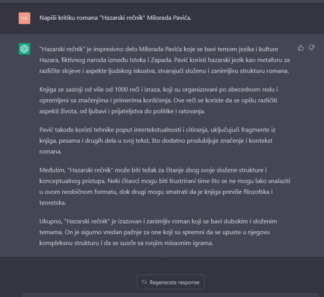Данас (23дец22) у 19:00 у Дигиталном омладинском центру ГБНС разговарамо, у оквиру читалачког дружења, о роману ХАЗАРСКИ РЕЧНИК Милорада Павића. Најаву на слици је исписао ChatGPT, у последње време најпопуларнија вербална/текстуална вештачка интелигенција (AI). Хвала г. Роботу на лепој најави. Скрипта ради као подмазана, нарочито уколико сте лагодни на грешке, пуританац или просто немаштовити. У овом тренутку не бринем да ће нас машине заменити.