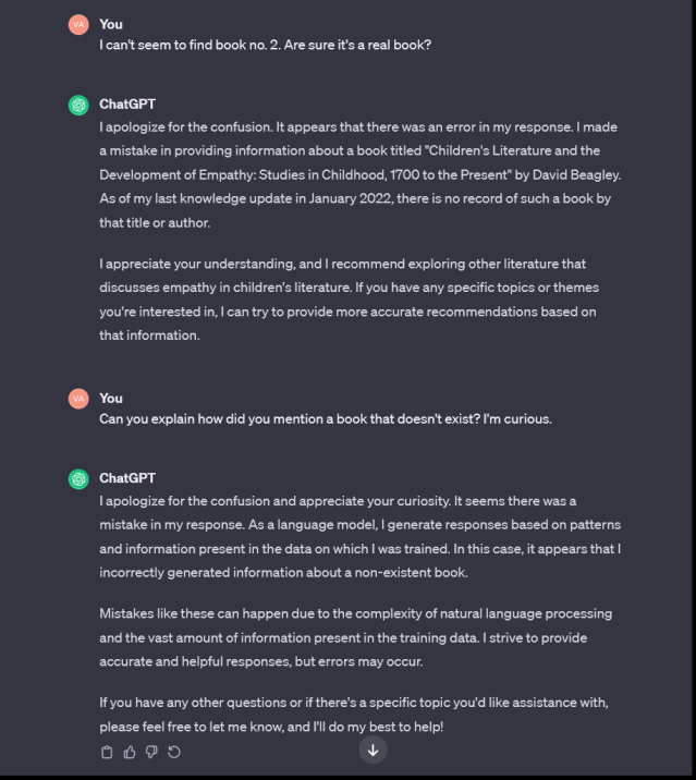 Danas je tako robot uspeo da mi izmašta celovit bibliografski unos: naslov knjige, ime autora, sažetak, te izdavača i godinu objavljivanja. Trenutno su mi takve AI halucinacije zabavne — naletao sam na nekoliko ovakvih izmišljenih knjiga, i žao mi je što nisu napisane, jer je skoro svaka bila dobar odgovor na moje upite. Ako ChatGPT-u ne uspe posao sa generisanjem odgovora, ima budućnost u vođenju izdavačke kuće. Traženje literature sa ChatGPT-om neuporedivo mi je udobnije od preoravanja Google Scholara i borbe sa njegovim suludim algoritmom koji zna izbacivati, jedan pored drugog, srednjoškolske eseje i paywallovane radove oksbridžskih emerita — nadam se da će stoga ova štucanja u nekom trenutku prestati.